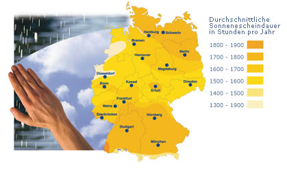 The annual solar radiation in Germany is completely sufficient for using solar energy. At our latitudes, one can expect an annual energy yield of approx. 800 to 1,000 kWh* with a 1 kWp in a grid connected system. In other countries or on other continents, even annual yields of up to 1.800 kWh are possible! Even if the sky is cloudy, our high-quality solar generators will generate energy.